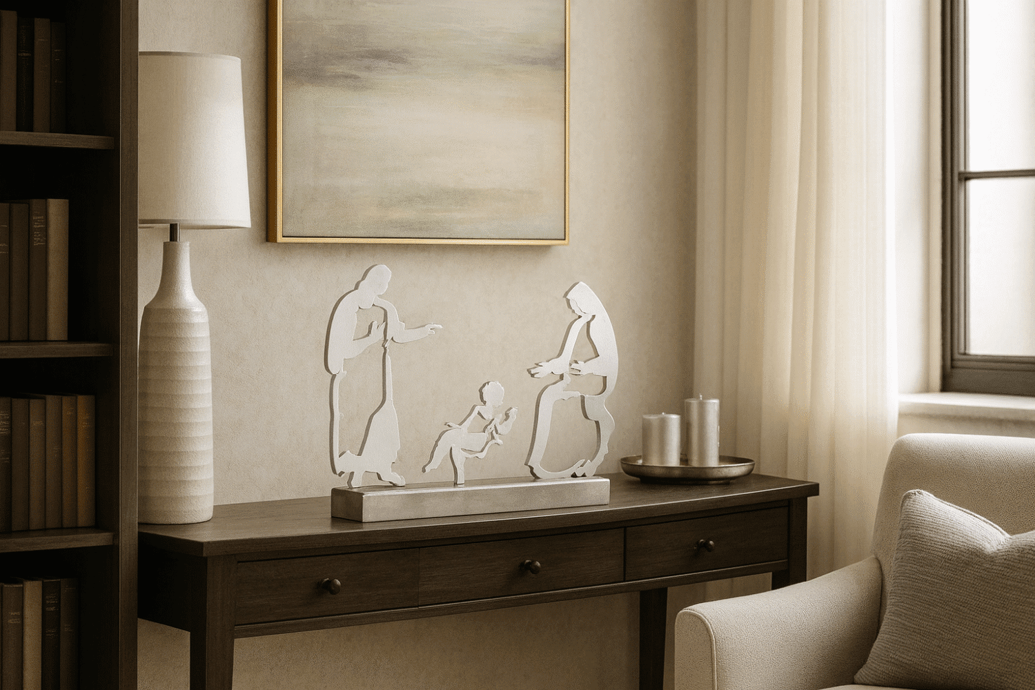 De traços discretos e sofisticados, este presépio transcende o significado de uma peça decorativa, resultando numa forma de expressão artística. Ideal para ambientes modernos, este conjunto distingue-se pela qualidade dos materiais e pelo rigor do acabamento.